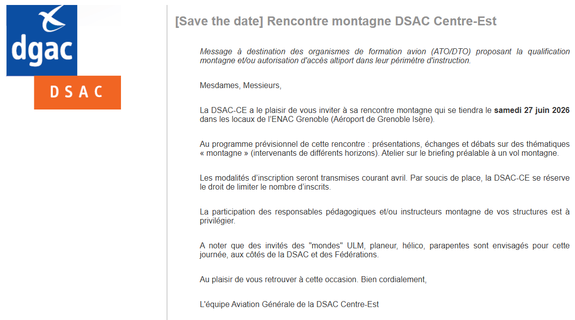 – Dimanche 1er : Assemblée Générale à l’ENAC, Grenoble Isère